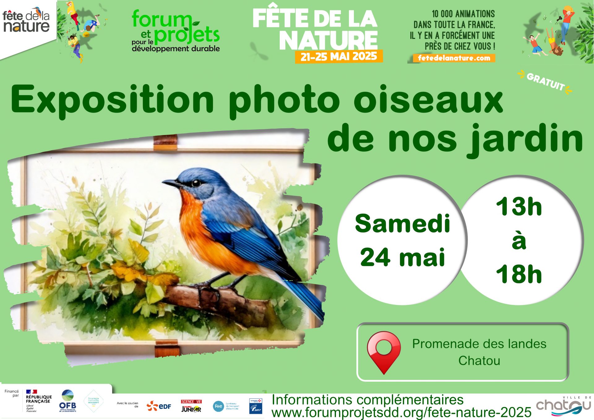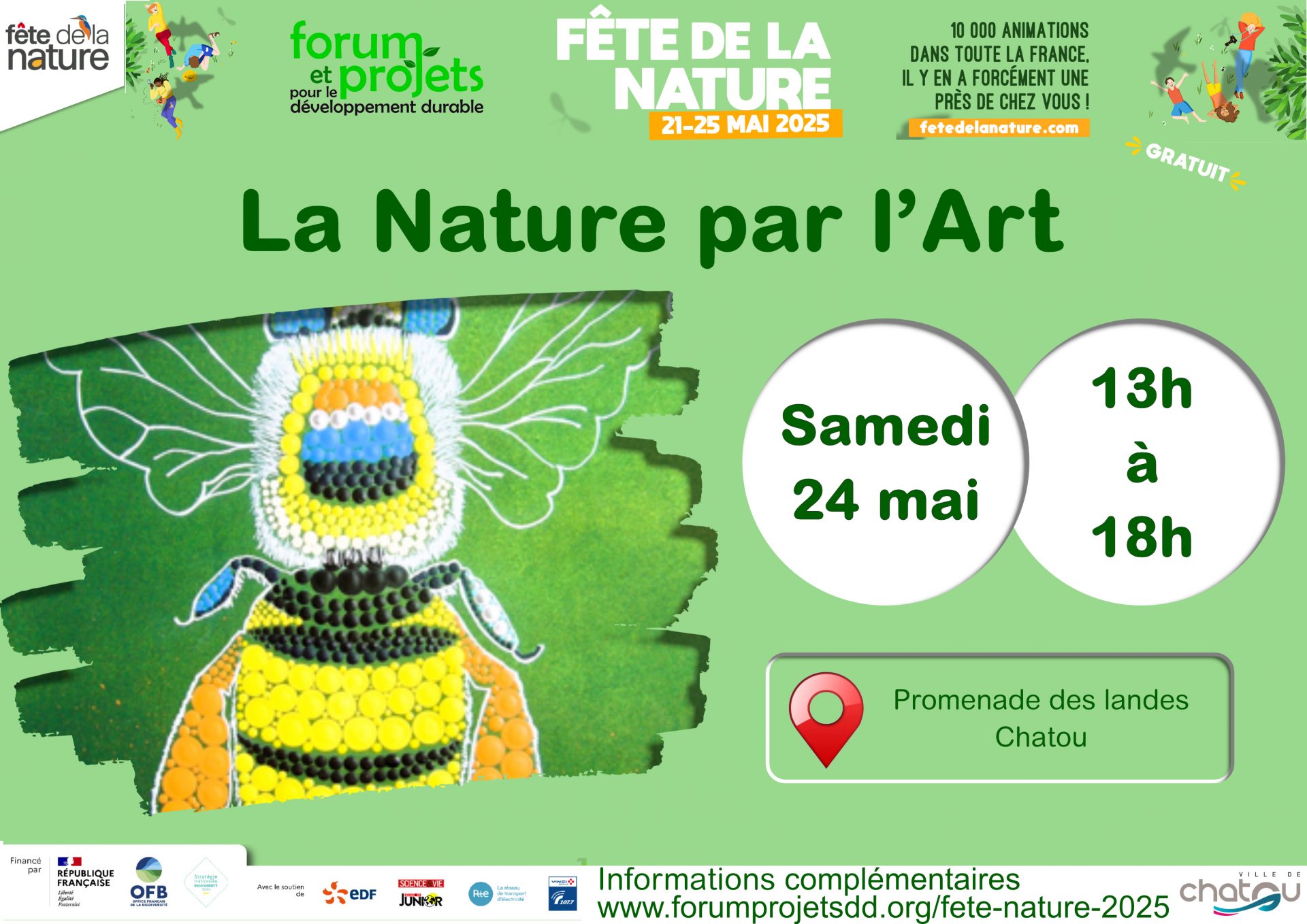 Organisée par Forum & Projets pour le Développement Durable, en partenariat avec les villes du Vésinet, de Chatou, de Croissy et de Montesson, la Fête de la Nature 2025 a marqué un temps fort de mobilisation citoyenne en faveur de la biodiversité. Pendant plusieurs jours, 23 activités ont été proposées au public, réunissant petits et grands autour d’une nature vivante, accessible, et pleine de surprises. Ce succès n’aurait pas été possible sans l’implication de 27 bénévoles, que nous remercions chaleureusement pour leur énergie, leur créativité et leur engagement.