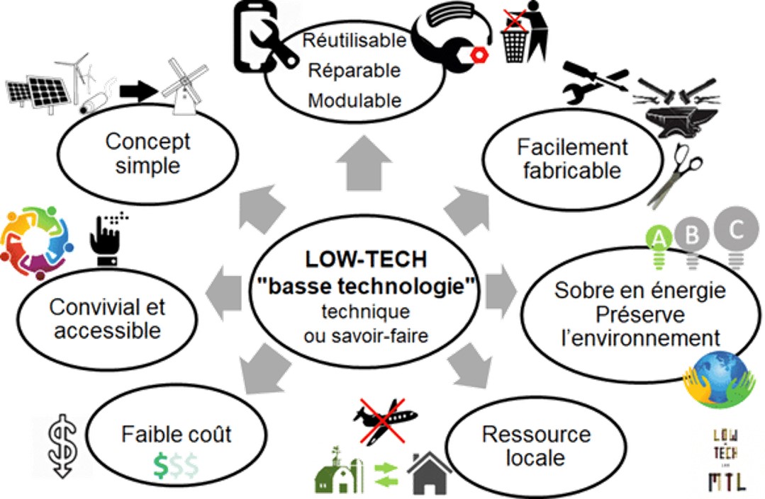 Dans son acception la plus simple actuelle, la Low-Tech est perçue comme un ensemble de technologies utiles (répondant à des besoins essentiels), accessibles (simples et peu onéreuses à réaliser/réparer localement,) et durables (complexité et impact/prélèvement sur ressources naturelles optimisés au strict nécessaire pour l’usage visé). ci-après pour illustration quelques exemples de Low-Tech :