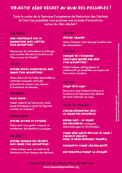 Dans le cadre de la Semaine Européenne de Réduction des déchets, le Quai des possibles vous propose une journée d’animations autour du Zéro déchet!