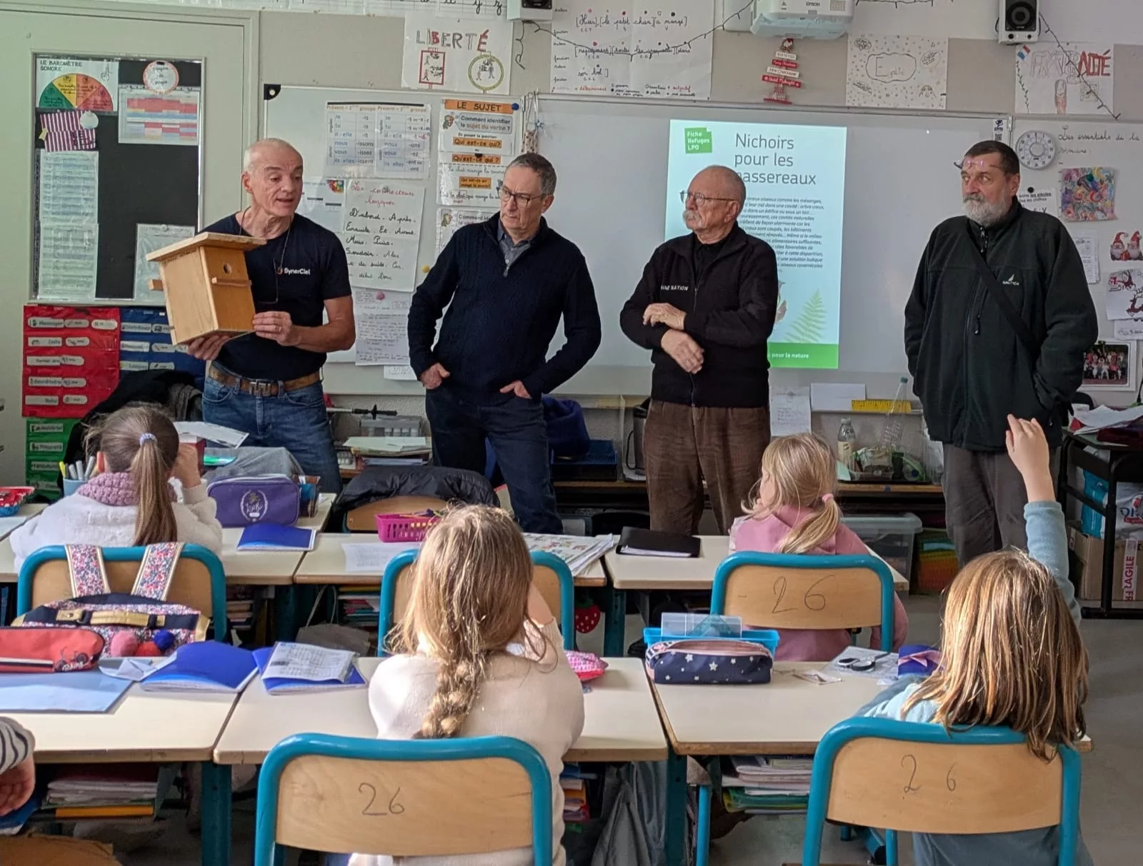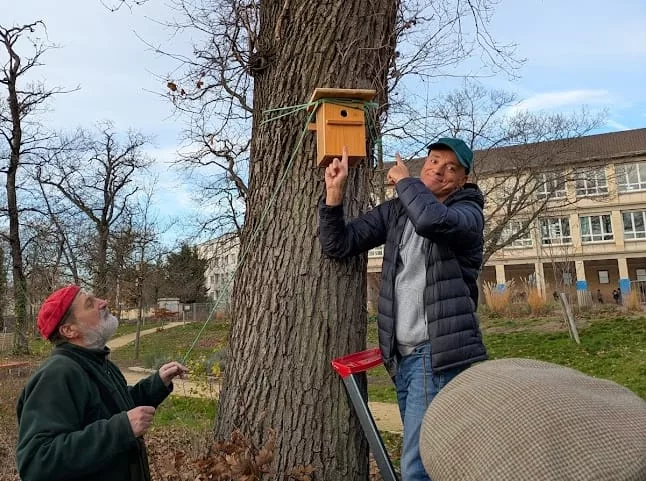 - Une présentation des membres du « gang », la description du projet par Adam, un échange avec les enfants autour des nichoirs (les outils nécessaires, comment l’assembler) puis l’installation concrète du nichoir choisi par la classe dans un arbre proche de la cour de récréation.